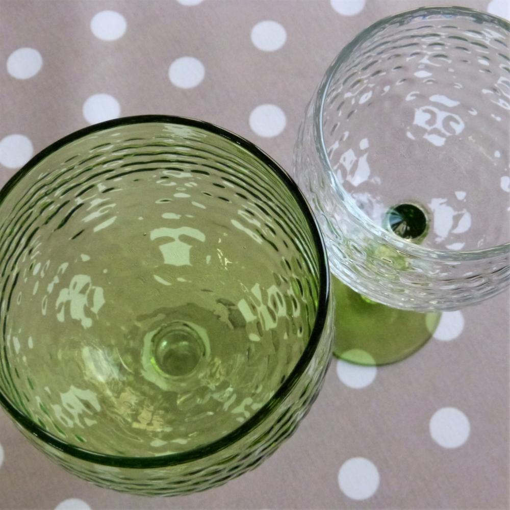 Verre à eau, coupe verte, pied transparent.Verre à vin, coupe transparente, pied vert.