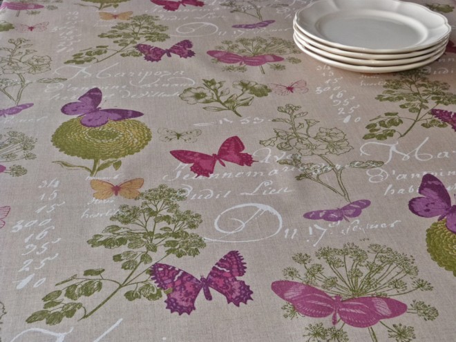 Une idée déco pour donner une touche de couleur à votre table et à vos repas avec la toile enduite en lin motifs papillons multicolores.